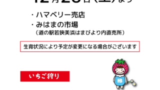 Information 美浜町にいちご農園『若狭美浜HAMABERRY』がグランドオープン! 2022年1月5日(水)、福井県三方郡美浜町にイチゴ観光農園がグランドオープンしました🍓地元美浜町の皆さまはもちろん、たくさんの方にHAMABERRYの美味しさを知っていただきたいと、スタッフ一同丹精込めて育てています。ぜひ皆さまお揃いで『... 2022.12.28 Information