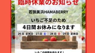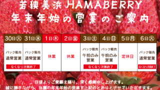Information 臨時休業のお知らせ 日頃はHAMABERRYをご利用いただき、誠にありがとうございます。現在「いちご不足」のため、12月27日(土)・28日(日)…臨時休業12月26日(金)29日(月)…定休日計4日間、休業いたします。30日(火)より営業いたします。ご理解の... 2025.12.25 Information
